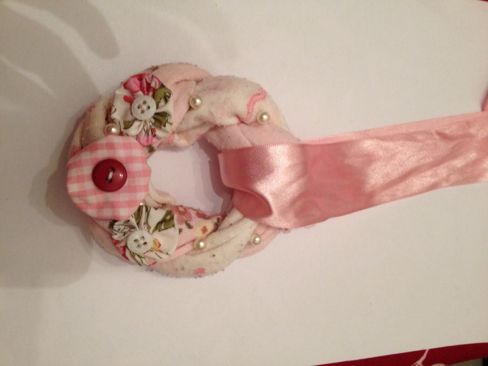 Két különböző harisnya lábszárait levágtam és osszecsavartam, majd a végénél elvarrtam. A díszítése nagyon egyszerű volt, ugyanis a virágok alapja egy egyszerű kör alap, amit a szélénél körbevarrunk és ahogy körbeértünk, összehúzzuk. Erre került egy-egy gomb, a koszorú alapra pedig még néhány gyöngy és szatén szallag.